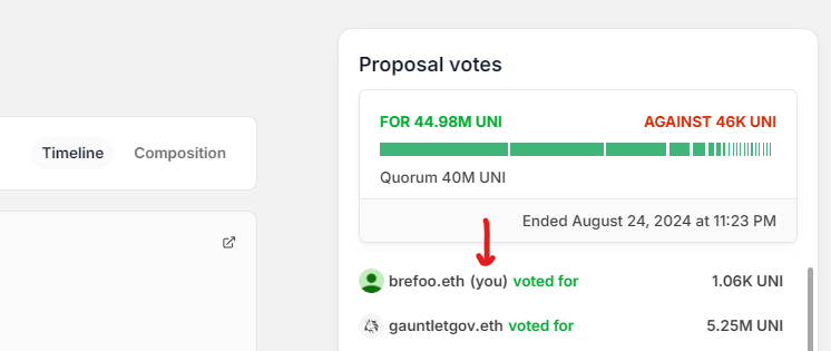 When you click to cast your vote, your wallet will pop up asking you to confirm your transaction. Click “submit” or "confirm", wait a bit, and check that the transaction has been confirmed. You can view your votes from your profile, or on the proposal itself.